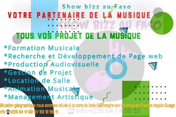 Bonjour la famille Show Bizz Au Faso ,Vous êtes plus de dix mille Personnes qui nous suivent d’ici et d’ailleurs encore une fois merci infiniment d’avoir pris contact avec la Maison D’actualité MusicalePour les Artistes ou Pour les Pros de la musique lance ta carrière musicale avec nous.Après quelques années de fonctionnement,la Maison D’actualité Show Bizz Au Faso s’entendentNous vous Proposons une fonctionnement Complète de service musicaux .Nous sommes votre meilleure Partenaire de Musique.Tous Vos Projet de Musique s’améliore ici*Production Audiovisuelle*Location de Salle de Répétition*Gestion de la Diffusion*Animation Musicale*Formation Musicale*Gestion de Projet*Création de site webShow bizz au Faso consiste à promouvoir les Artistes d’ici et d’ailleurs, nous sommes disponibles pour vos Activités musicales.Info ☎️ :+226 64 14 50 510 /58 18 96 15Gmail : showbizau2@gmail.comYouTube : Show bizz au FasoFacebook : Show bizz au Faso